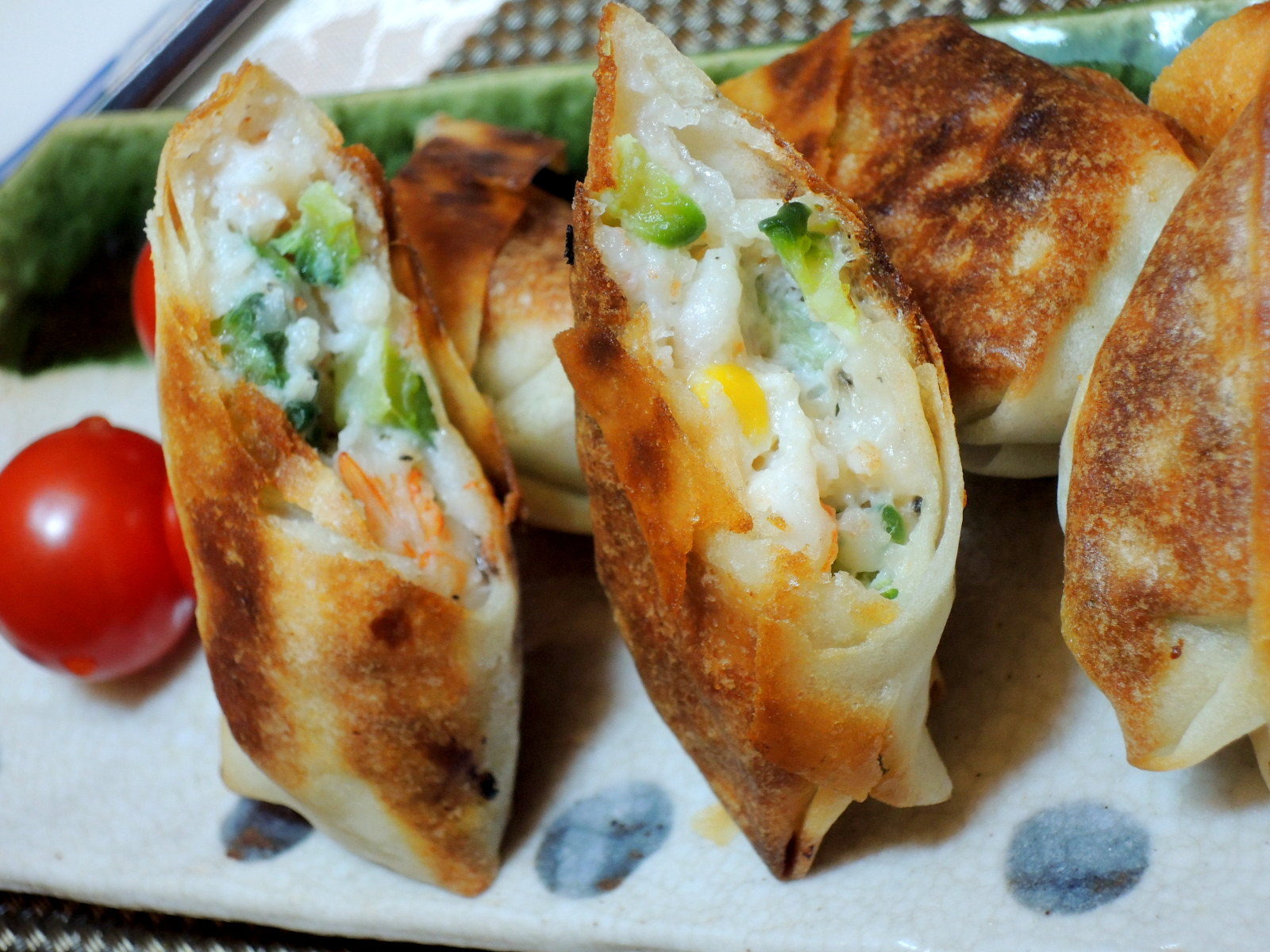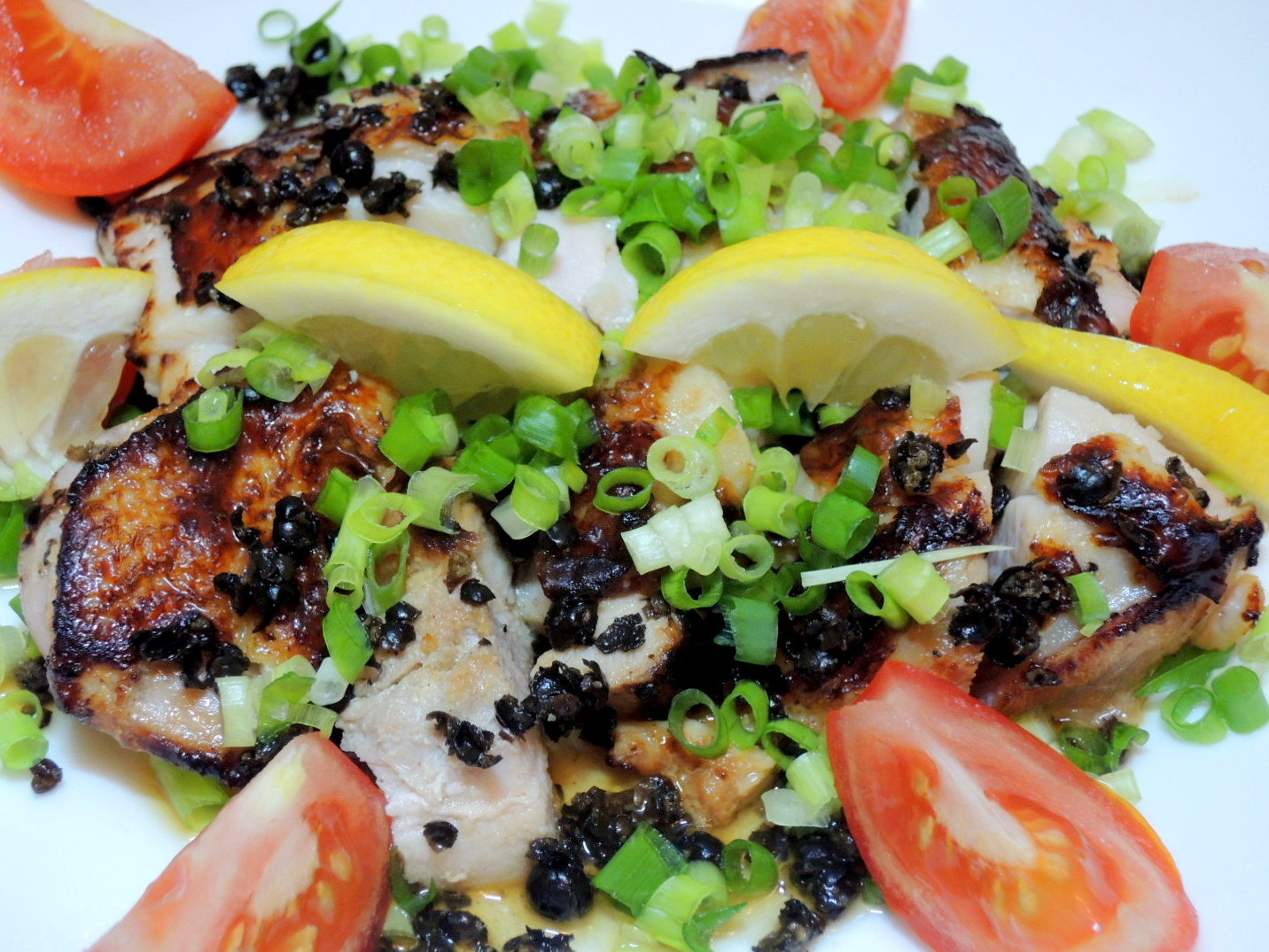 生胡椒、小ネギを乗せてレモンとトマトを飾る
