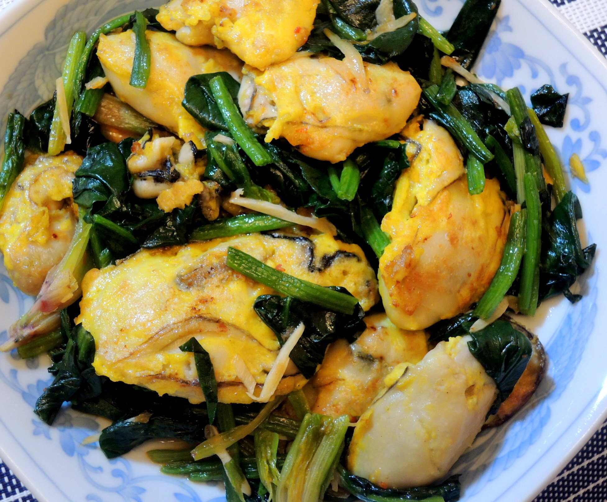 牡蠣とほうれん草のソテー牡蠣は卵黄+小麦粉で黄金焼にして