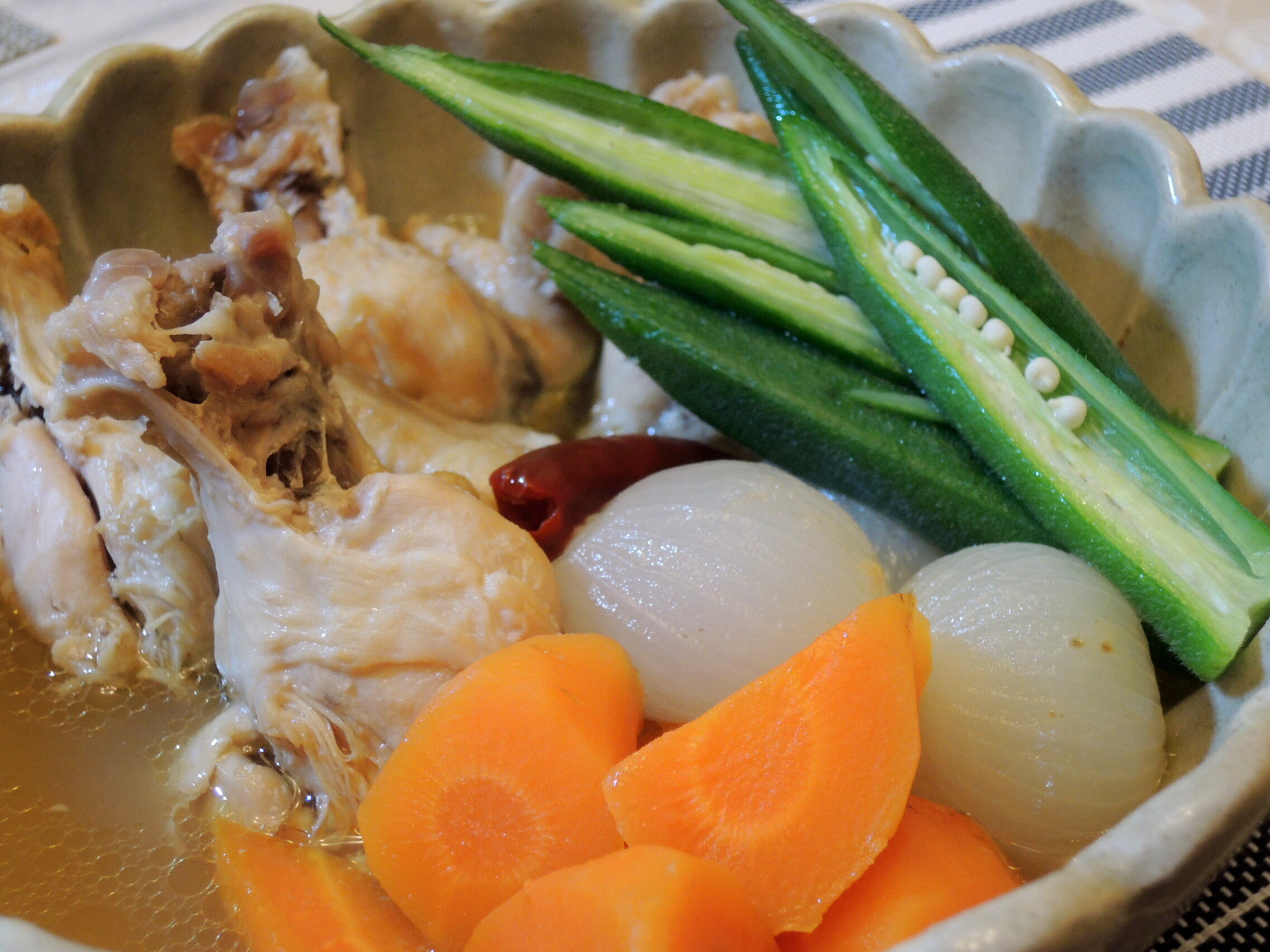 1の鶏肉の皮を下にして入れる
